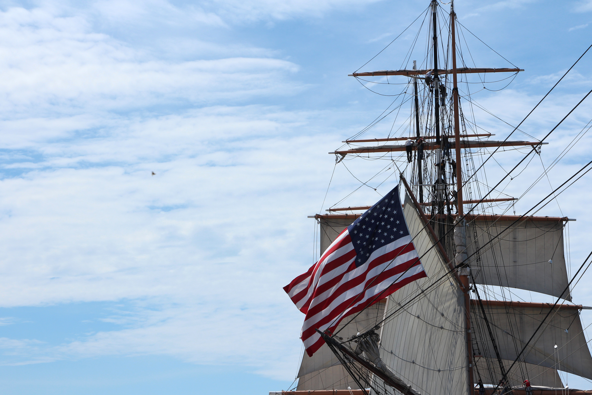 The flag flying over the Star of India welcoming visitors to the annual Festival of Sail at the Maritime Museum of San Diego.