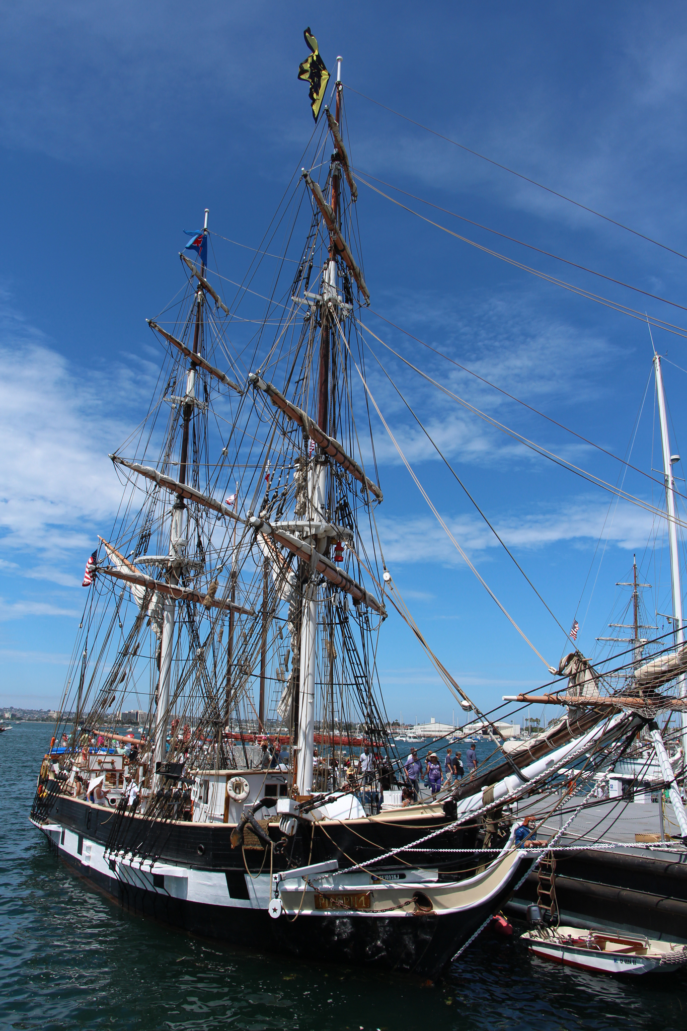 The “Spirit of Dana Point” sails by the “Californian” which is docked. The “Californian” joined the the historic fleet of ships at the Maritime Museum of San Diego in 2002. She is the Official Tall Ship of the State of California and helps carry out the educational missions o the Maritime Museum by hosting hundreds of students year round, in a variety of American history, sail training and Youth-at-Risk programs. The general public can sail her on weekends, special event sails and adventure sail expeditions to Catalina Island. She was designed as a replica of the 1847 revenue cutter, “C.W. Lawrence.” Built long and lean, revenue cutter patrolled the California coast during the Gold Rush era and were a precursor to today’s Coast Guard. Length: 145′ Rig: Top Sail Schooner Built: 1984, San Diego Home Port: San Diego, CA